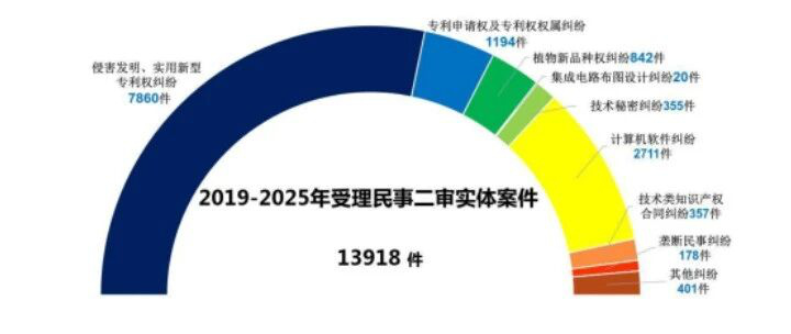 法庭共受理民事二审实体案件13,918件。其中,侵害发明、实用新型专利权纠纷7,860件,专利申请权及专利权权属纠纷1,194件,植物新品种权纠纷842件,集成电路布图设计纠纷20件,技术秘密纠纷355件,计算机软件纠纷2,711件,技术类知识产权合同纠纷357件,垄断民事纠纷178件,其他纠纷401件。