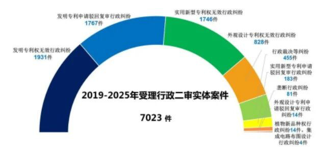 法庭共受理行政二审实体案件7,023件。其中,发明专利申请驳回复审行政纠纷1,767件,发明专利权无效行政纠纷1,931件,实用新型专利申请驳回复审行政纠纷183件,实用新型专利权无效行政纠纷1,746件,外观设计专利申请驳回复审行政纠纷14件,外观设计专利权无效行政纠纷828件,植物新品种权行政纠纷14件,集成电路布图设计行政纠纷4件,垄断行政纠纷81件,行政裁决等纠纷455件。