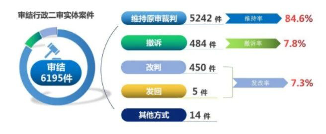 法庭审结的6,195件行政二审实体案件中,以维持原审裁判方式结案5,242件,占84.6%;以撤诉方式结案484件,占7.8%;以发回重审方式结案5件,占0.1%;以改判方式结案450件,占7.3%;以其他方式结案14件,占0.2%。