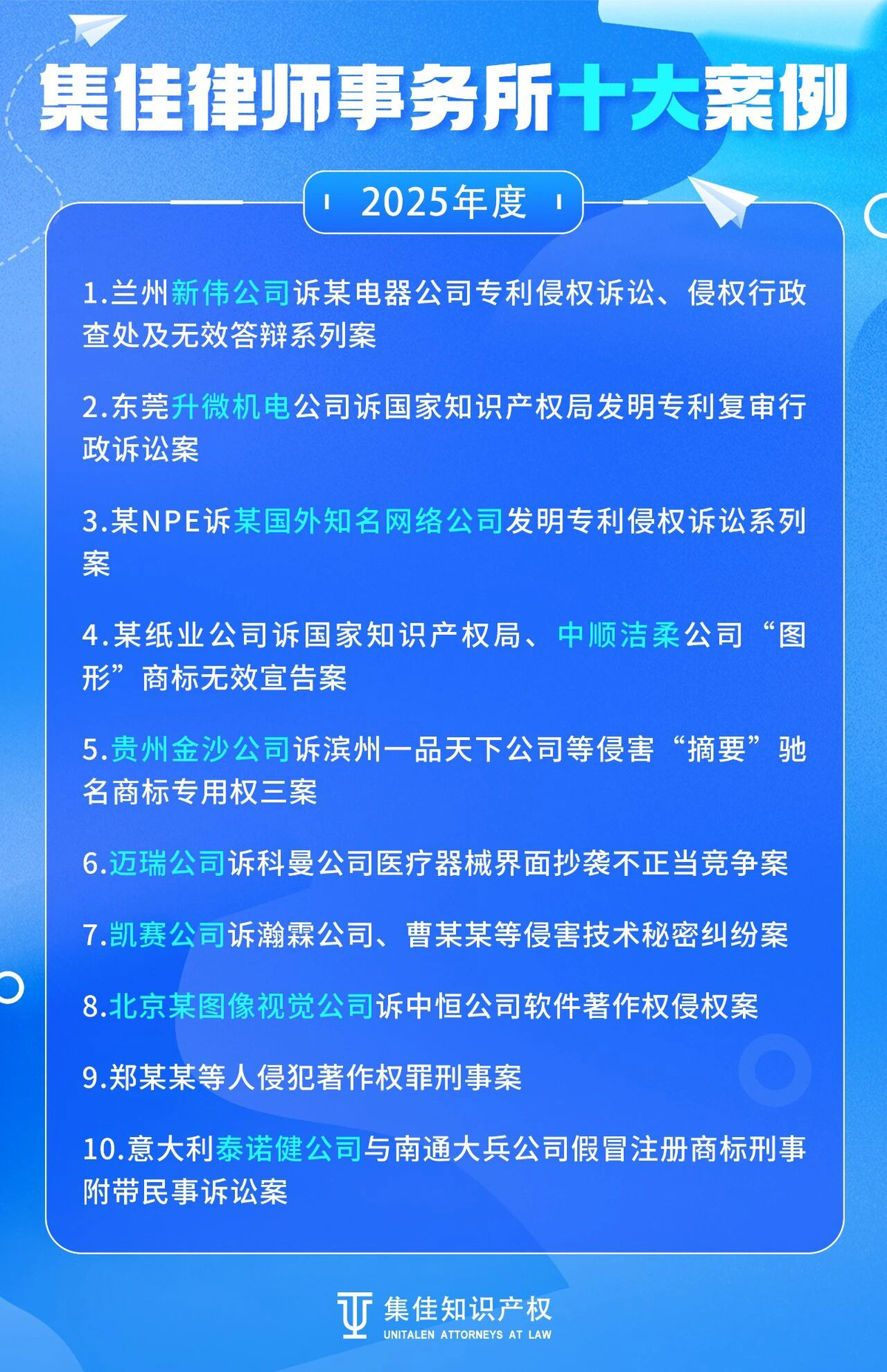 在世界知识产权日来临之际,集佳律所从代理的众多知识产权案件中筛选出2025年度具有代表性的十大案例,与各界同仁分享。这些案例具有较强的法律适用的典型意义和较大的社会影响,既彰显了我国知识产权保护的高水准,也展现出诉讼代理团队的专业能力,更为同类案件的维权实践提供了可借鉴的参考路径。以下为北京市集佳律师事务所2025年度十大案例名录: