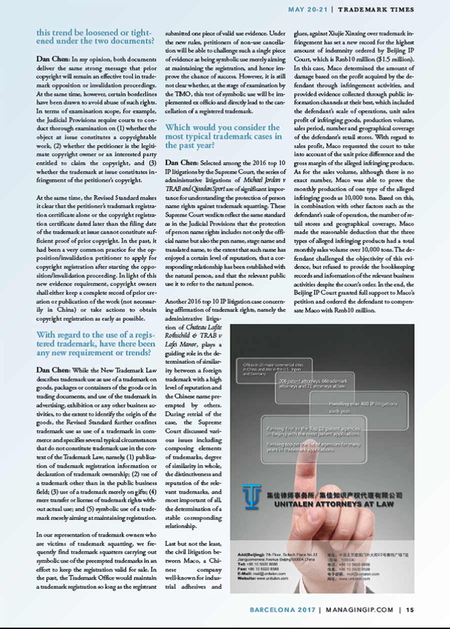 集佳合伙人陈丹律师文章在 INTA 会刊 Trademark Times 发表