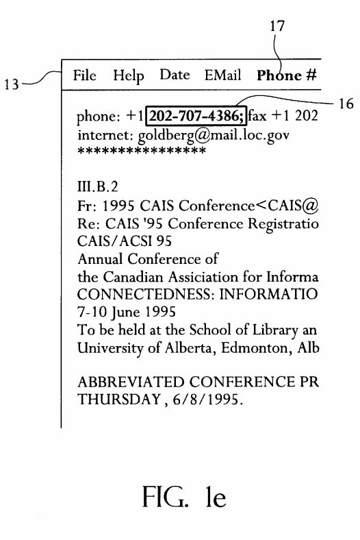 唯一的现有技术参考文献是Pandit的美国专利No.5,859,636,其公开了识别文档中不同类型的文本并基于此来为用户提供建议。在附图1e和1f公开的实施例中,当识别出文本为电话号码时,可以在下拉菜单中为该号码提供“拨打”、“添加到通讯录”等选项。