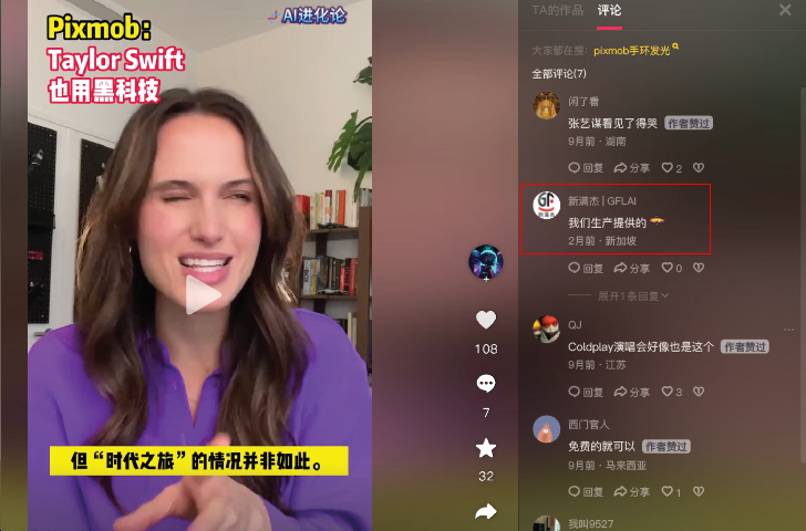 本案中,系争商标被系争商标申请人申请在第11类商品上,同时系争商标申请人同时也生产发光手环商品,与申请人处于同一商业领域。系争商标申请人仅申请了9枚商标,数量较少。在调查系争商标申请人行动之时,代理人发现系争商标申请人的关联公司在抖音社交媒体关于国际巨星、歌手Taylor Swift(泰勒斯威夫特)的演唱会上使用申请人的PIXMOB发光手环的视频下面(见下图),主动声称该手环为其公司生产制造。代理人立刻对该证据进行了固定。