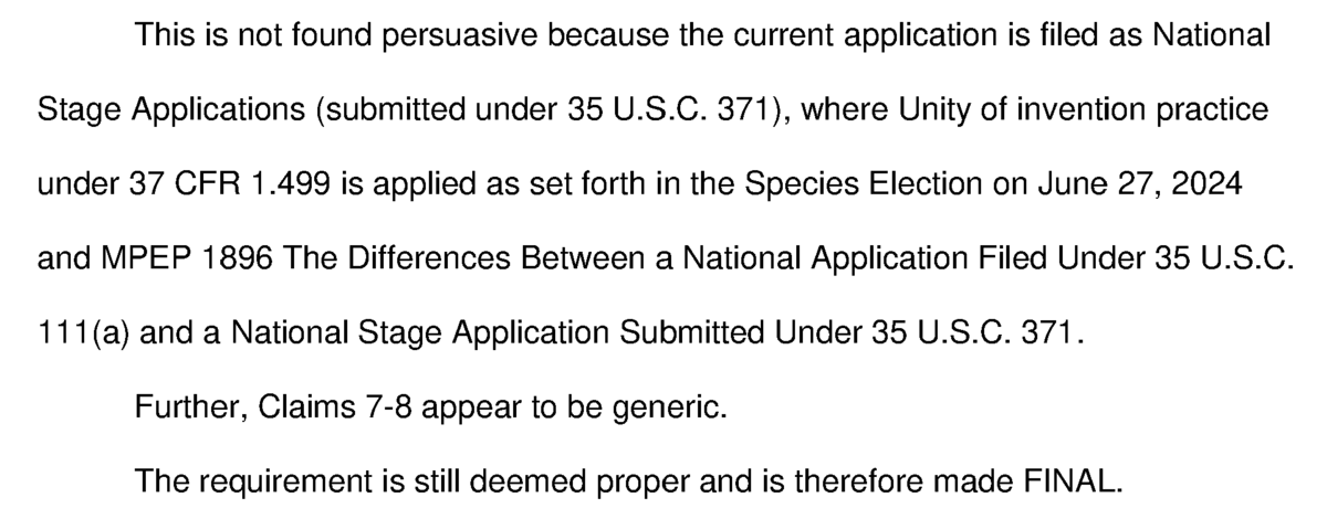 (一)发明的限制性要求:当审查员认为一件申请中包含多组(Groups)发明时,可以要求申请人在独立权利要求之间进行选择,例如,产品及其制造方法、整体设备及其子组件等;