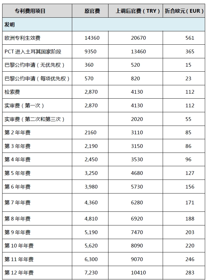 自2025年1月1日起,土耳其专利局适用新的官费标准。