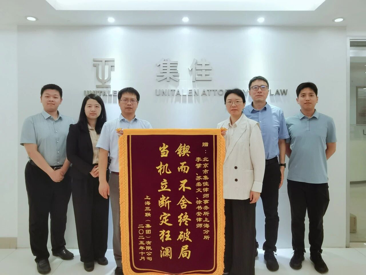 近日,集佳上海分所代理的上海三联(集团)有限公司(以下简称“上海三联集团”)与上海某公司、大丰某公司等侵害商标权及不正当竞争纠纷案的执行取得重大进展,上海三联集团代表专程莅临集佳上海分所,送来表扬锦旗。