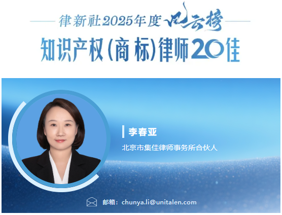 集佳合伙人李春亚律师荣登“律新社2025年度风云榜:知识产权(商标)律师20佳”榜单