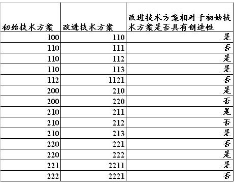 第二步,在理清各技术方案之间的关系之后,根据箭头的数量,确定初始技术方案与改进技术方案之间对应关系,形成下表1中第一一列和第二列:
